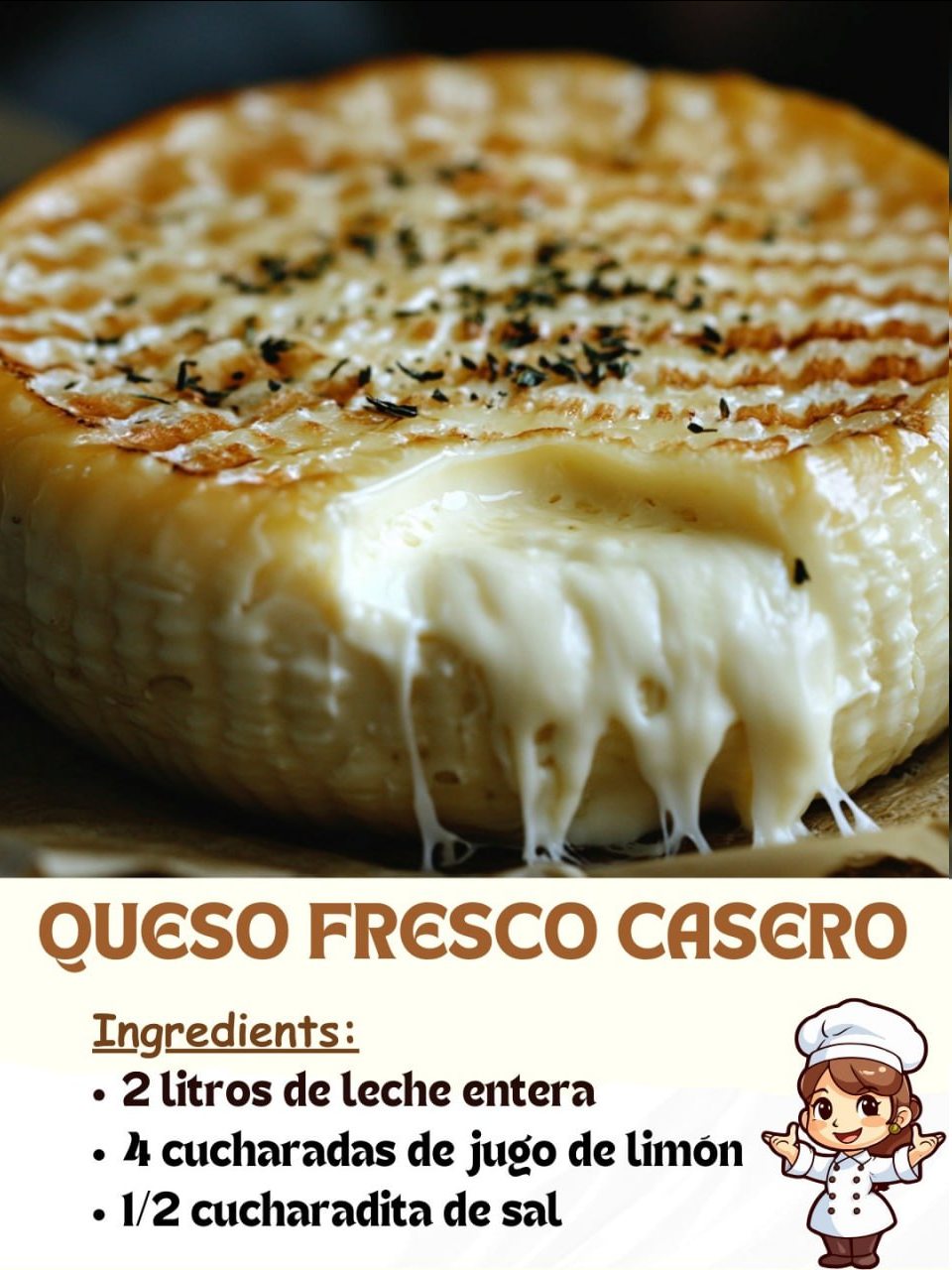 Ingredientes: 2 litros de leche entera (puede ser de vaca o cabra, pasteurizada pero no ultrapasteurizada) 4 cucharadas de jugo de limón o vinagre blanco 1/2 cucharadita de sal (opcional, al gusto) Instrucciones: ⏬⏬ continúa en la página siguiente ⏬⏬