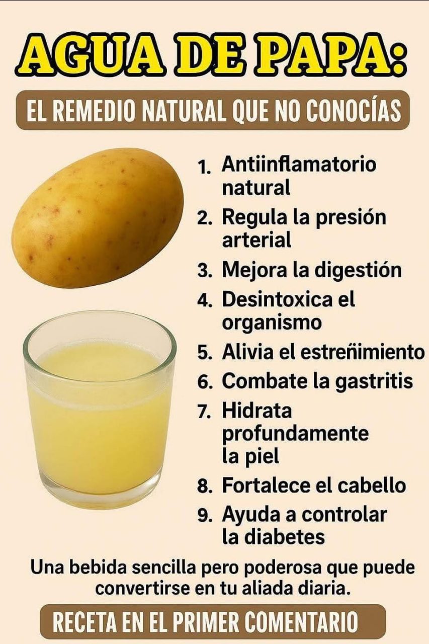 El agua de papa es un remedio natural muy usado en la medicina casera por sus propiedades nutritivas y curativas. Se obtiene al hervir o remojar papas en agua, y concentra parte de sus vitaminas, minerales y antioxidantes. AquĆ tienes sus principales beneficios: