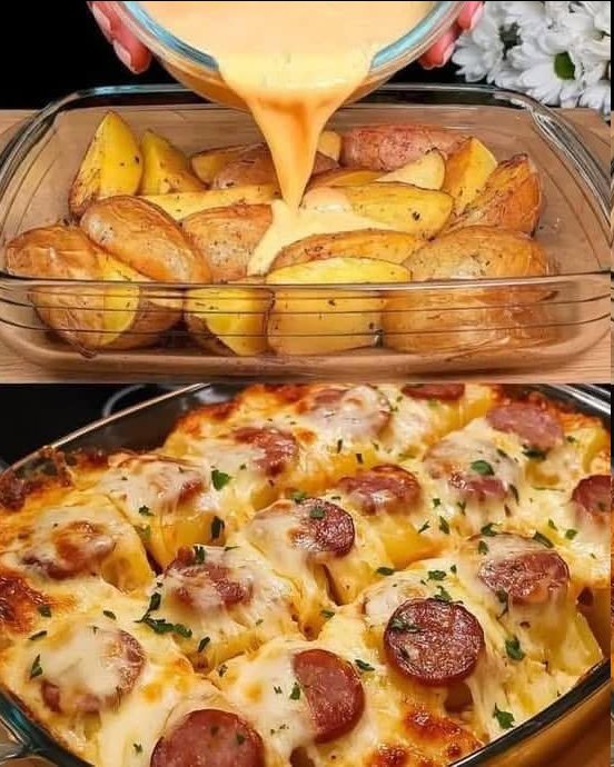 No hay nada más satisfactorio que una deliciosa cazuela de patatas al horno con queso y salchichas. Este plato es una combinación perfecta de papas doradas, salsa de queso cremosa y salchichas ahumadas, todo horneado a la perfección. Ideal para cenas familiares, reuniones o simplemente cuando deseas disfrutar de una comida casera reconfortante.