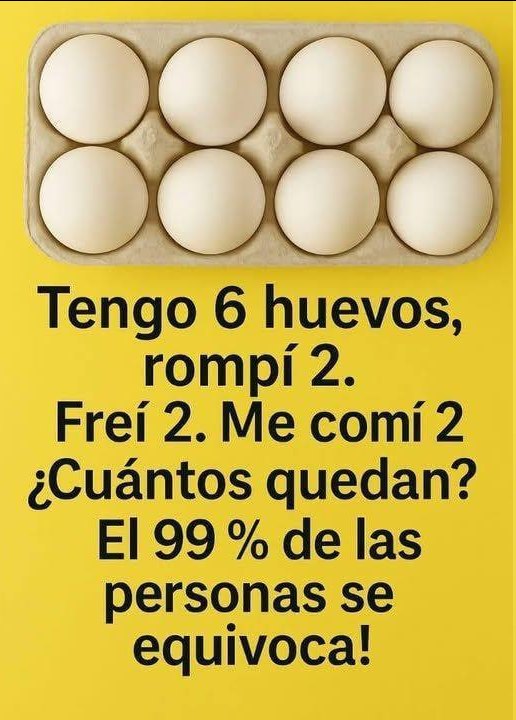 “Tengo 6 huevos. Rompí 2. Freí 2. Me comí 2. ¿Cuántos huevos me quedan?”