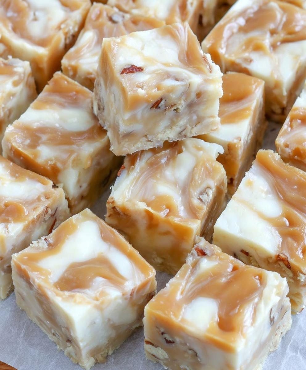 Prueba este fudge de chocolate blanco relleno de nueces pecanas y cubierto de caramelo. Sus ricos sabores combinan a la perfección con una taza de té o café. Me gusta tener este fudge a mano como refrigerio o postre después de comer.