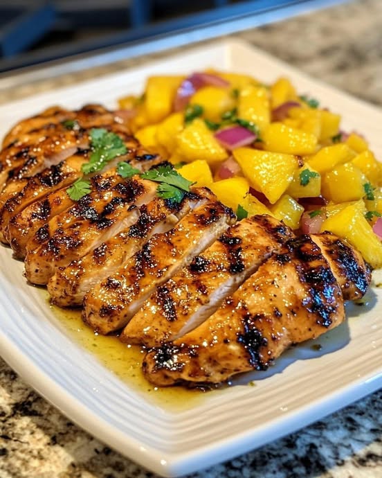 Sirve el pollo en rebanadas sobre un plato y acompaña con la salsa tropical por encima o al lado. ¡Decora con más cilantro y juguito extra! ✨