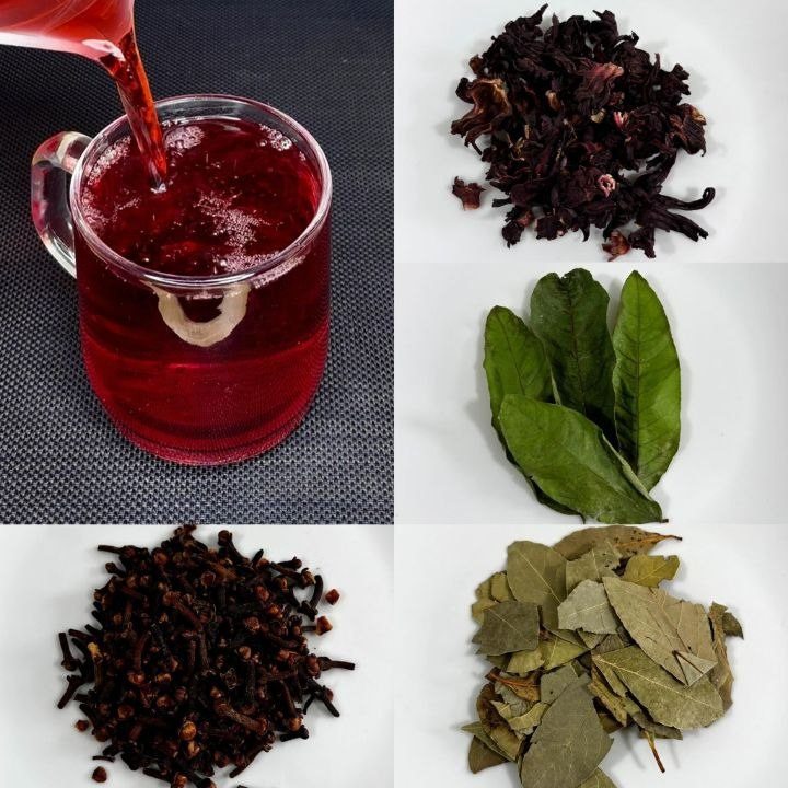 Esta infusión combina flores de Jamaica, clavos de olor, hojas de laurel y hojas de guayaba, todos conocidos por sus beneficios medicinales:
