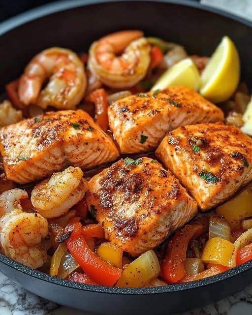 Salmón cajún y camarones